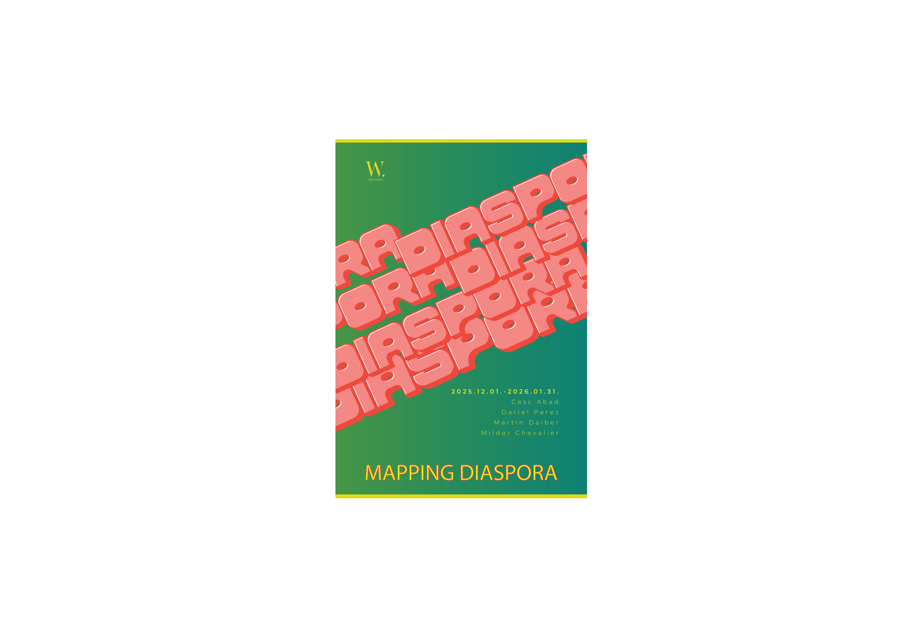 Mapping Diaspora 참여 작가 : Dariel Perez, Cesc Abad, Mildor Chevalier, Martin Daiber전시 일정 : 2025.12.01 - 2026. 01.31전시 시간 : 화 - 토 / 11:00 - 18:00장소 : W.ART GALLERY(더블유아트 갤러리) | 서울 마포구 독막로29길 48, 2층